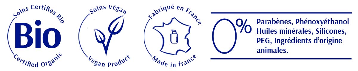 Tous nos soins sont: Certifiés Bio*, Vegan, Recyclables et Fabriqués en France.